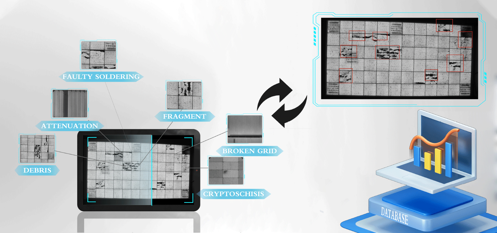 可檢測識別缺陷類型:隱裂/斷柵/裂紋/破片/邊緣過刻/碎片/黑心/黑邊/短路/燒結網紋/材料缺陷/低效率片/失配/衰減/熱斑效應/PID..