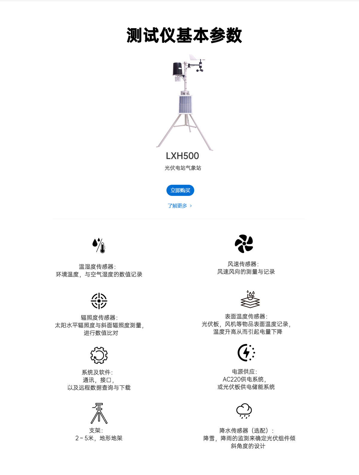 氣象站是萊科斯一套關(guān)于太陽(yáng)能測(cè)量數(shù)據(jù)采集的系統(tǒng),應(yīng)用與光伏發(fā)電,光熱電站,風(fēng)力發(fā)電領(lǐng)域的氣象監(jiān)測(cè),整套設(shè)計(jì)符合CAISO標(biāo)準(zhǔn),適用于資源評(píng)估與電力監(jiān)測(cè)。